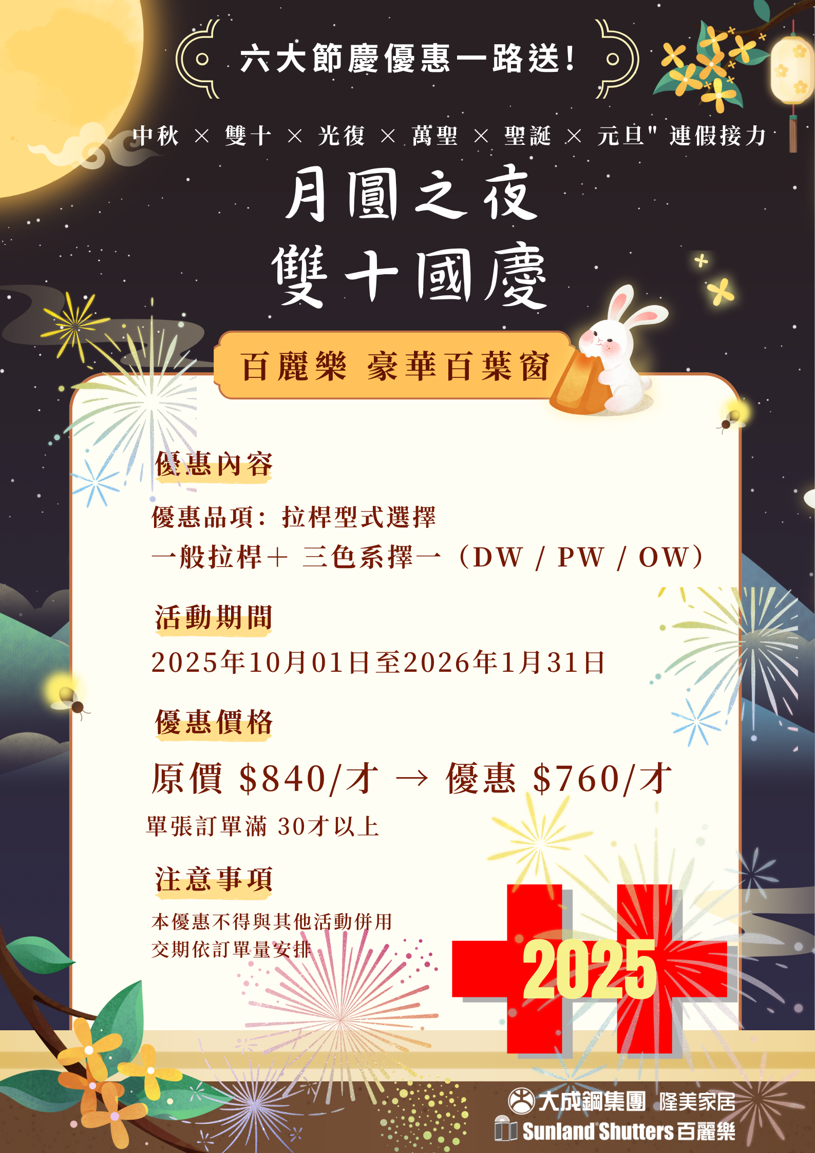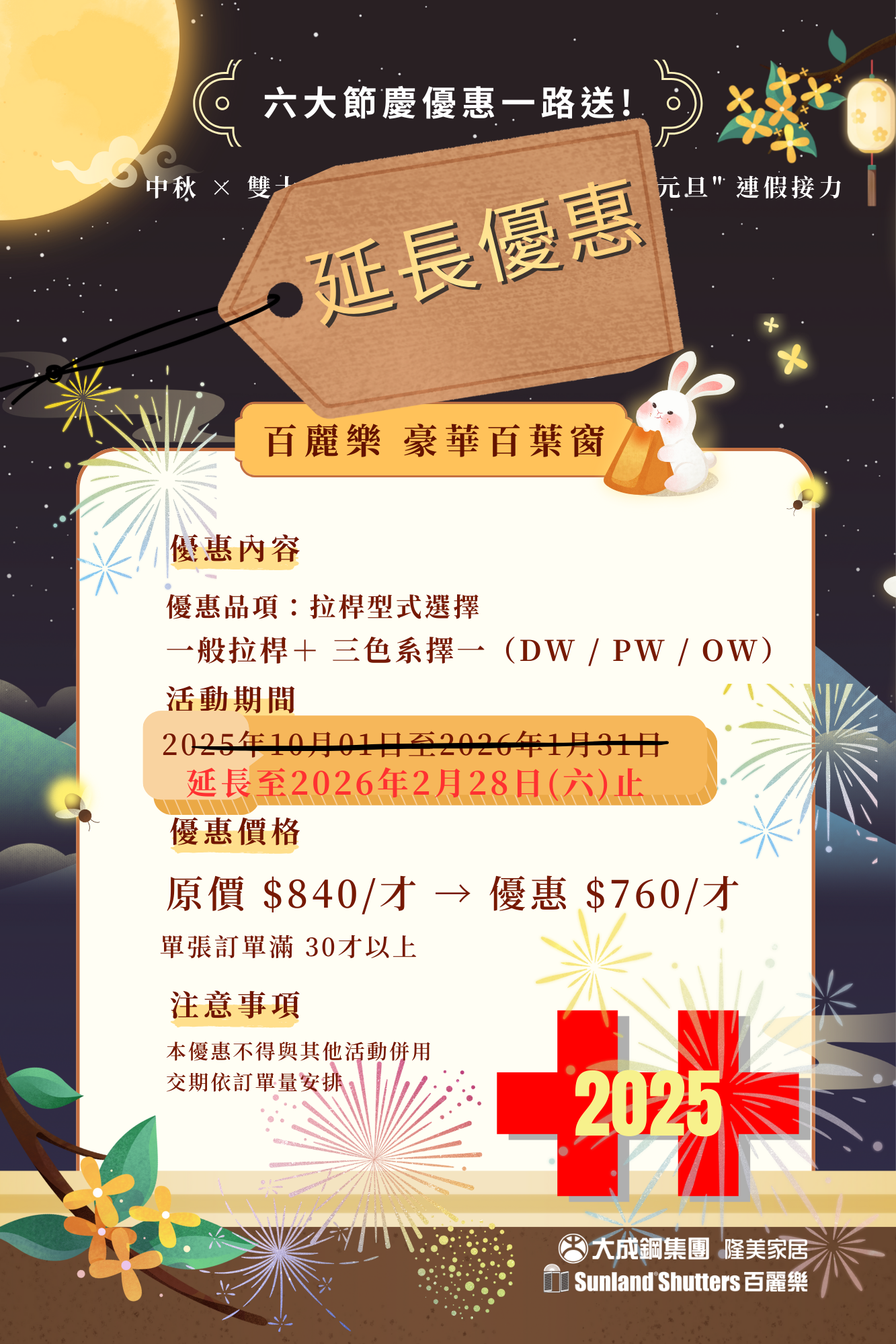 📣 百麗樂豪華百葉窗【六大節慶優惠專案】正式加碼延長至 2026/2/28!